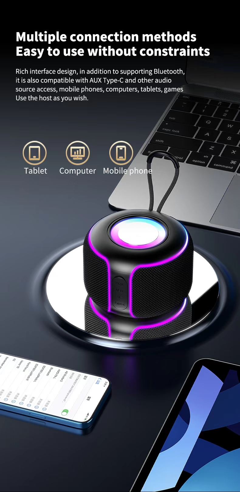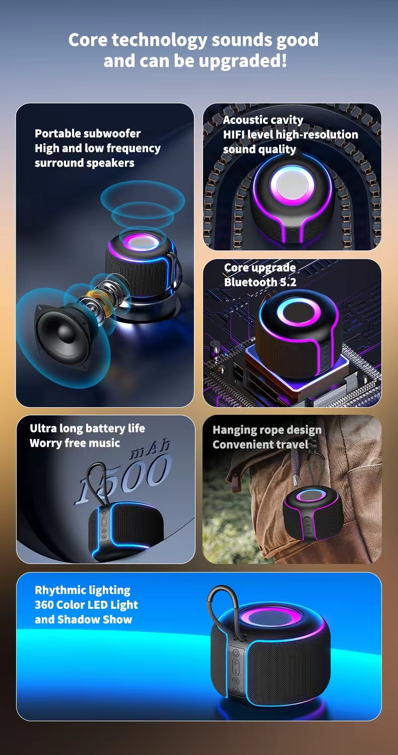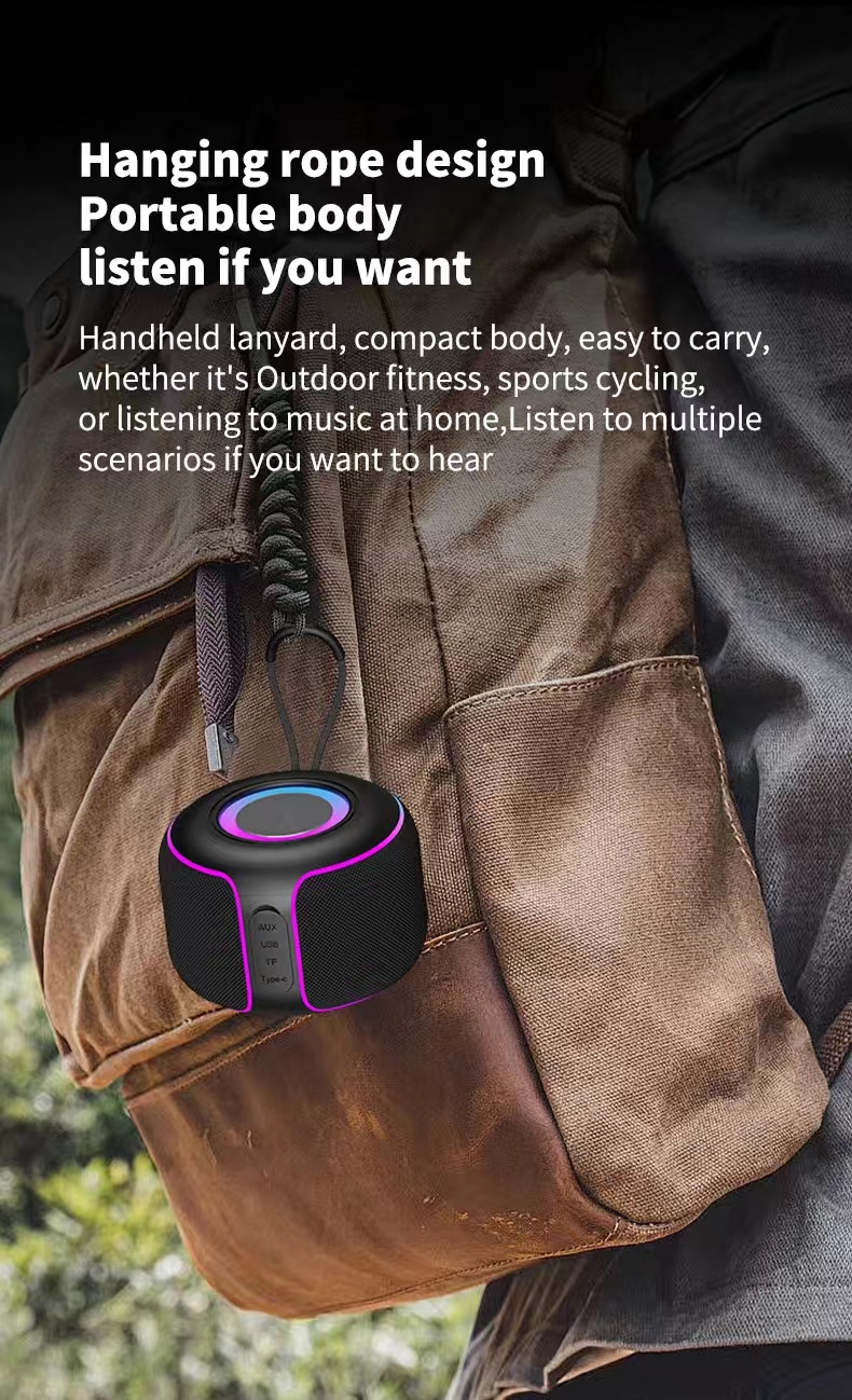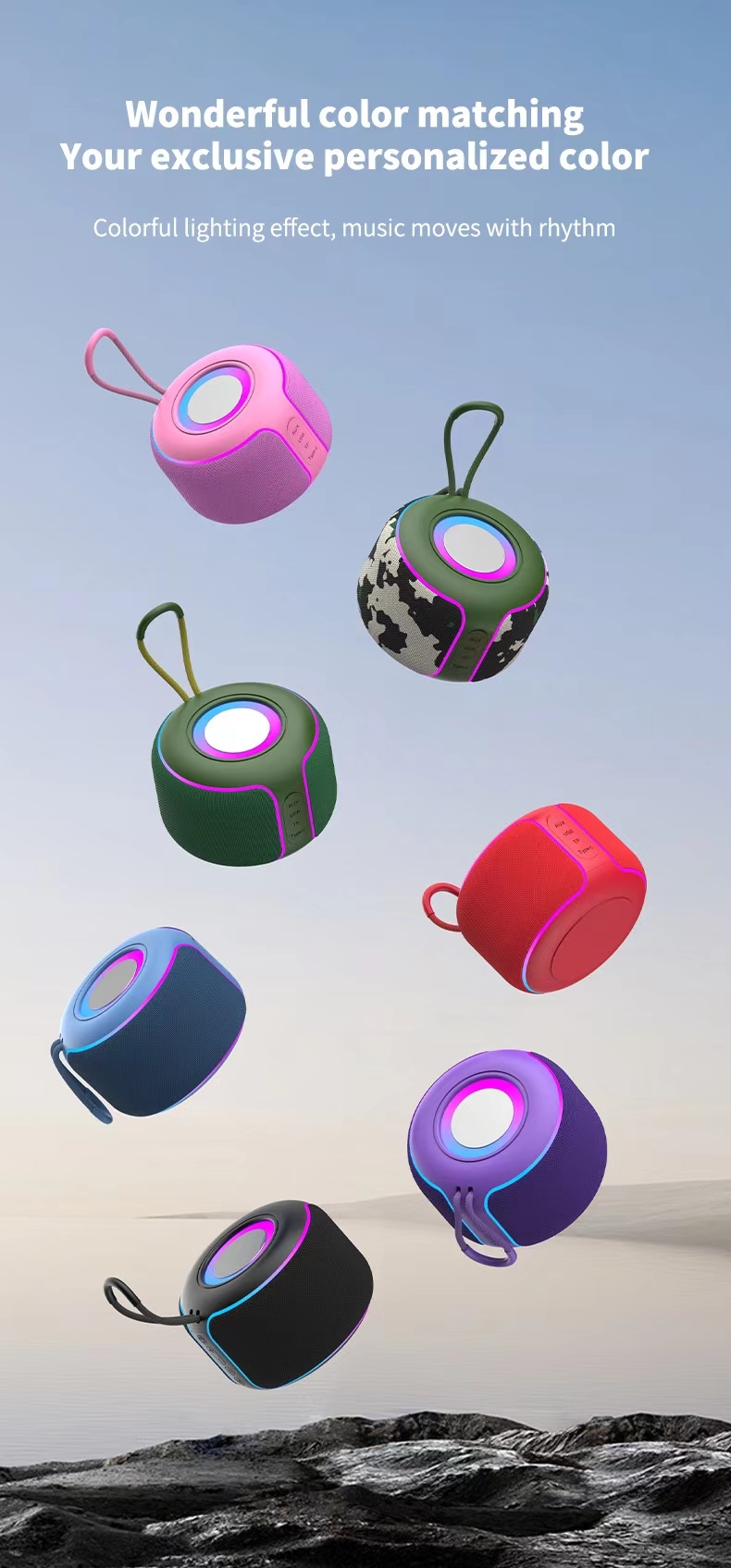 Hot selling RGB light mini wireless outdoor speaker fabric lanyard and plastic battery powered portable BT stereo subwoofer