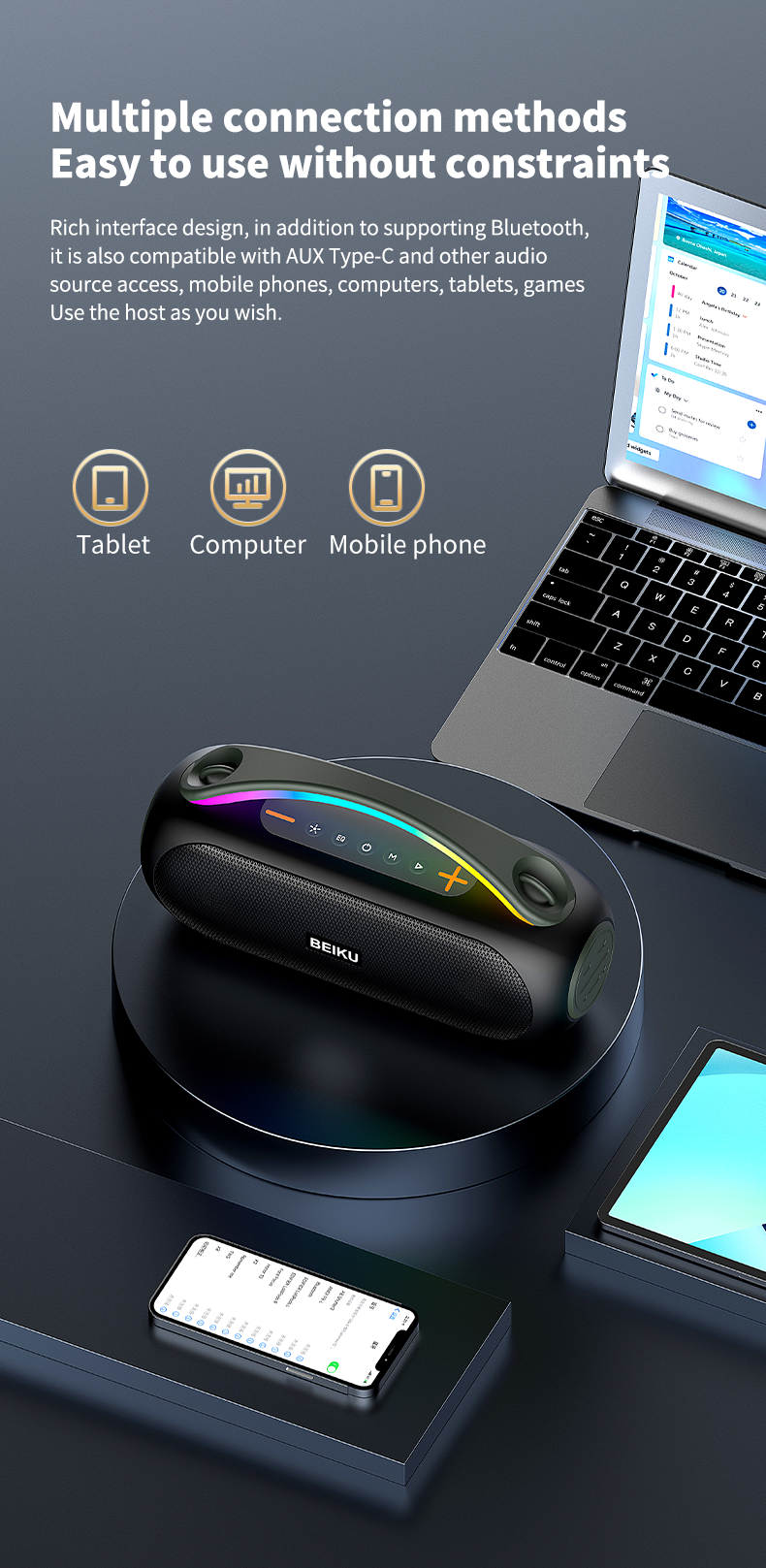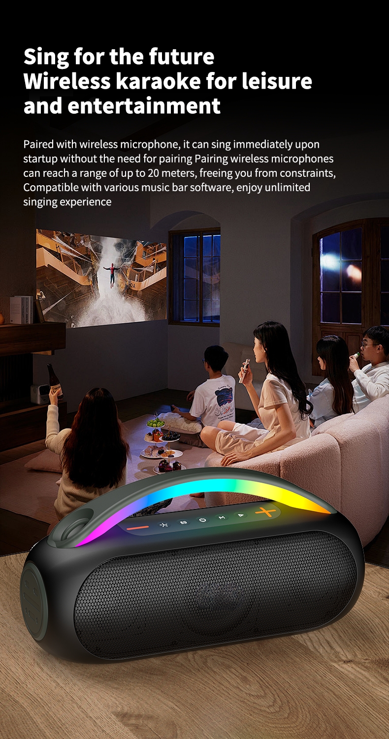 4- ●Bluetooth version: JL 5.3,● Battery capacity: 8000HA (16850/2000 capacity X4),● Total power: 40W,● Working voltage: 7.4V,● Function: Bluetooth playback, MIC, AUX, USB, TF, RGB colorful lights